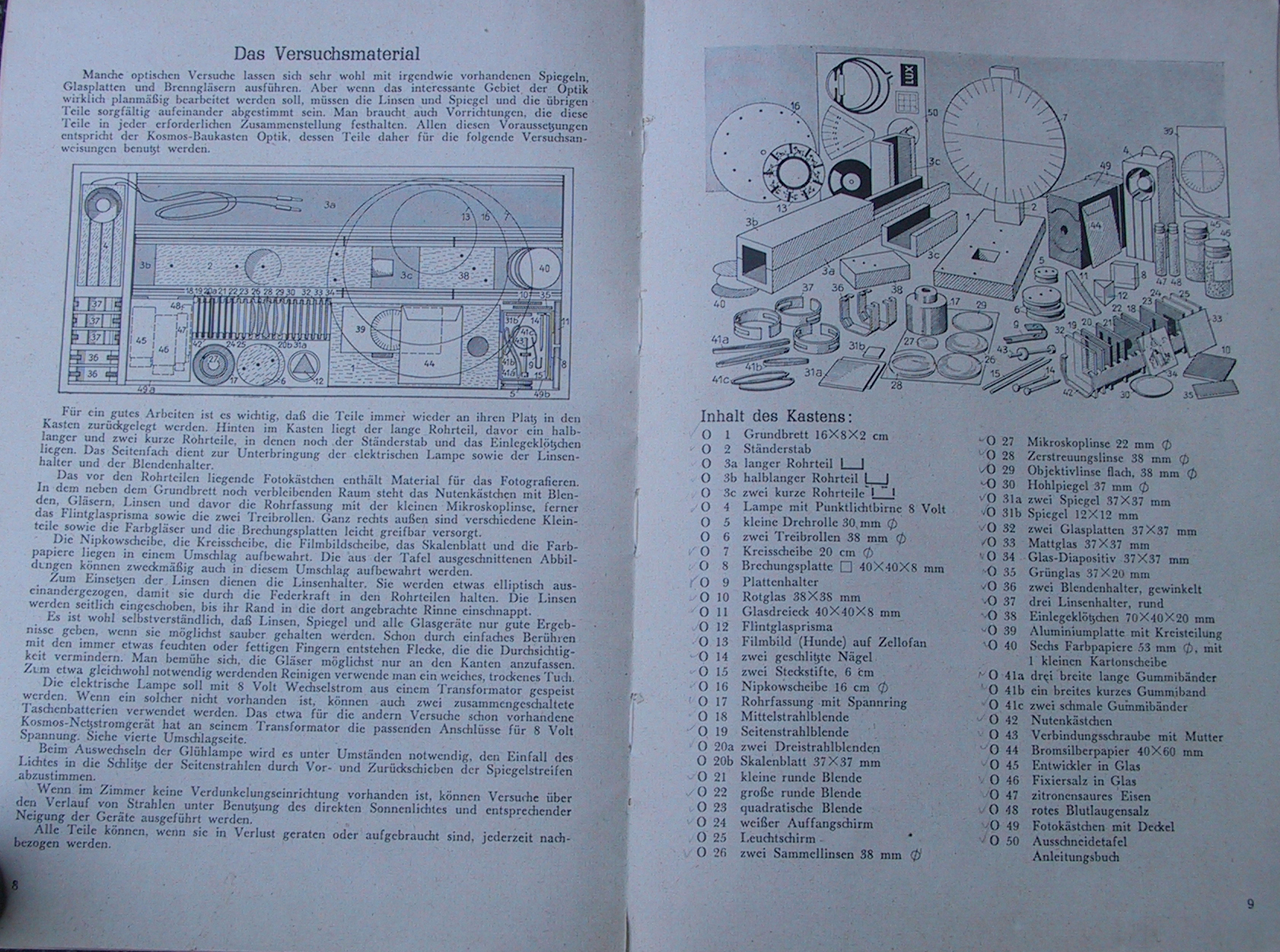 Nach einem Inhaltsverzeichnis aus dem Jahre 1938, welches mir Georg freundlicherweise zur Verfügung gestellt hat, ist der Kasten bis auf 2 fehlende Spiegel vollständig. Darüber hinaus sind aber noch weitere, nicht aufgeführte Teile vorhanden, wie z.B diese.